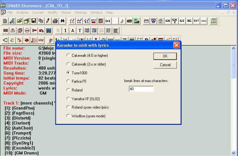 Prekonvertujte cez – convert – Karaoke to midiwith lyrics a začiarknite CAKEWALK prípadne TUNE 1000.
