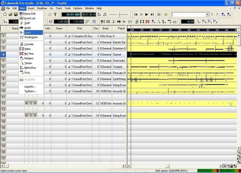 Program s názvom CAKEWALK. Existuje skupina ľudí, ktorá na tvorbu muziky používa zo zásady iba CUBASE, či už na midi alebo audio. Sám medzi nich patrím, ale ak si potrebujem otextovať midi, CAKEWALK je ten pravý. Na otextovanie môžete použiť akúkoľvek verziu CAKEWALKu alebo dnes uz vyššie verzie nesúce názov SONAR. Ukážka je spracovaná na verzii 9, ale osobne som textoval aj na verzii 3.